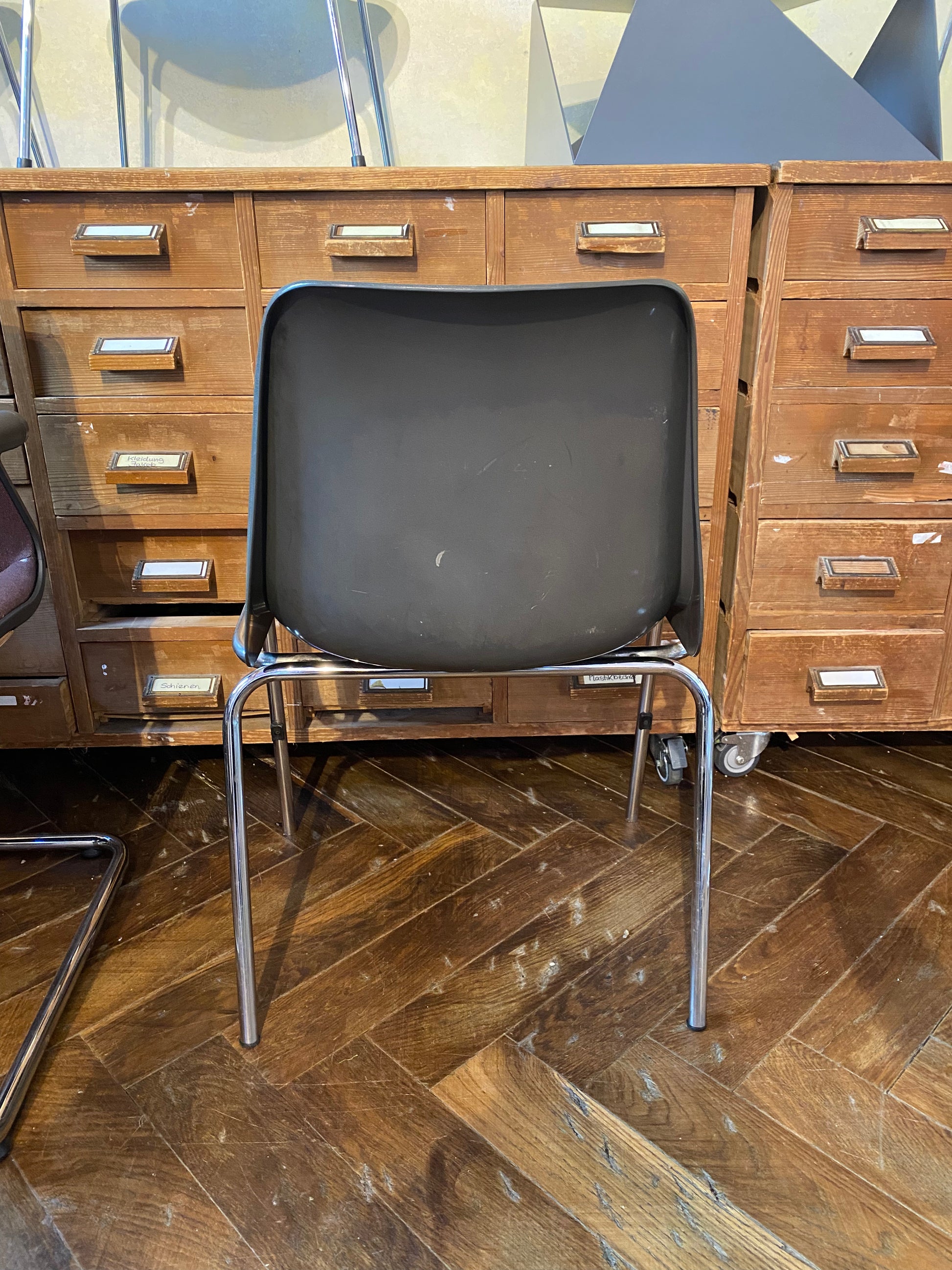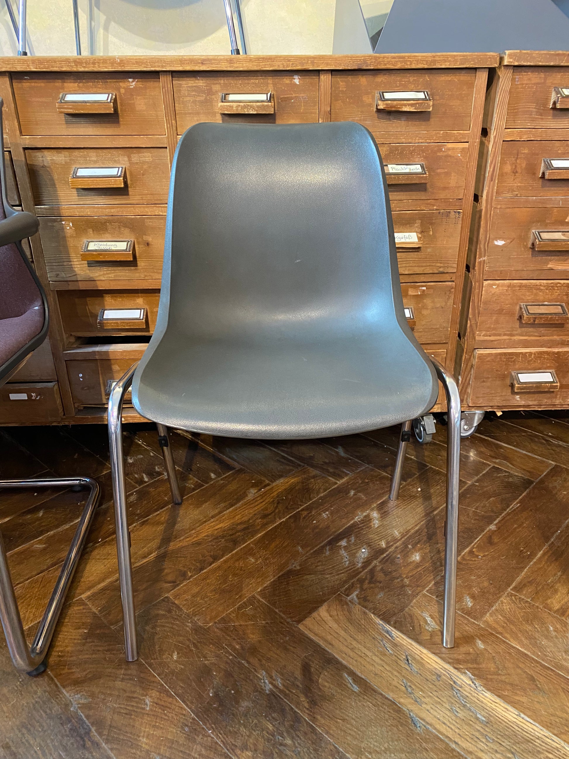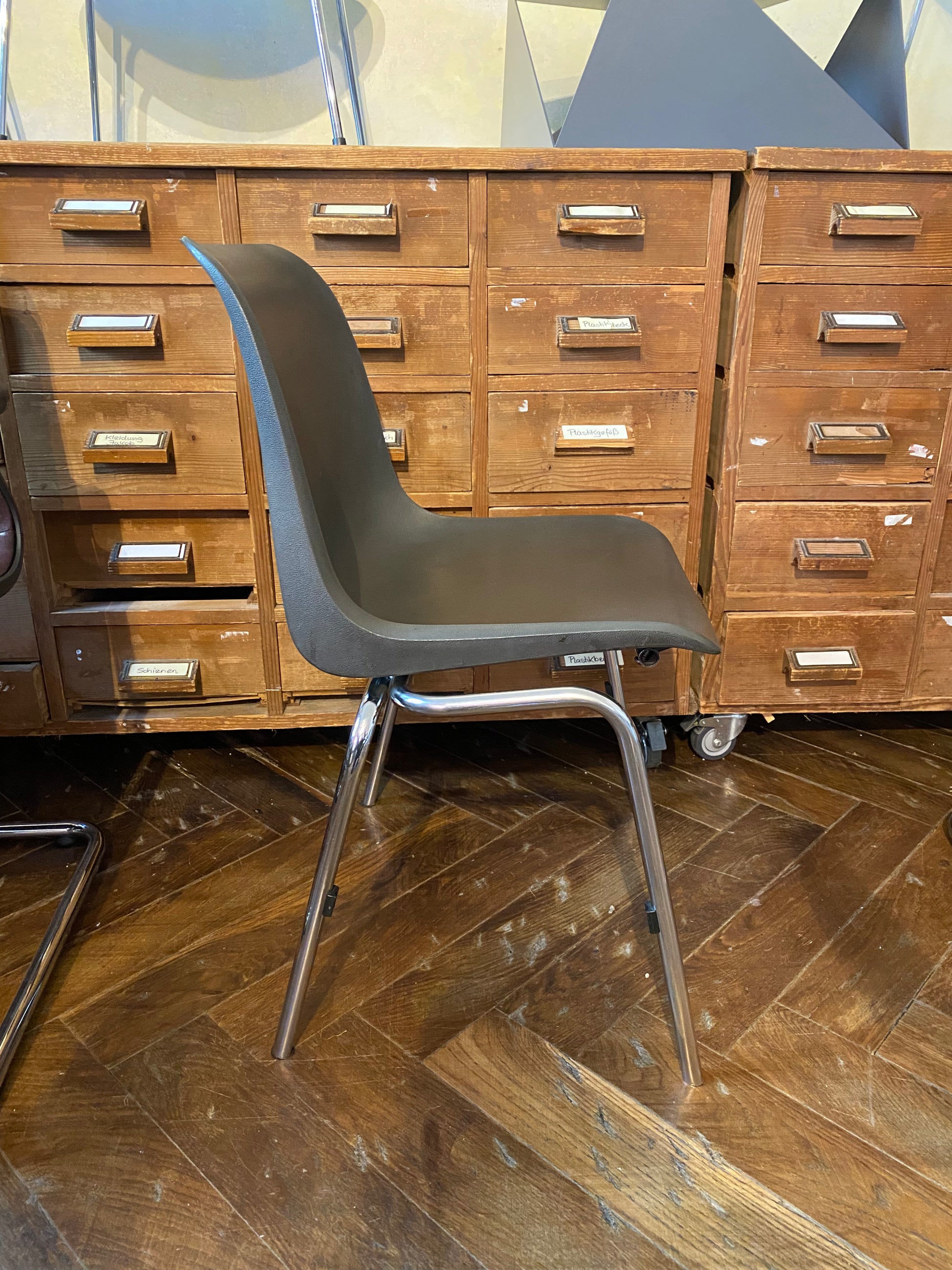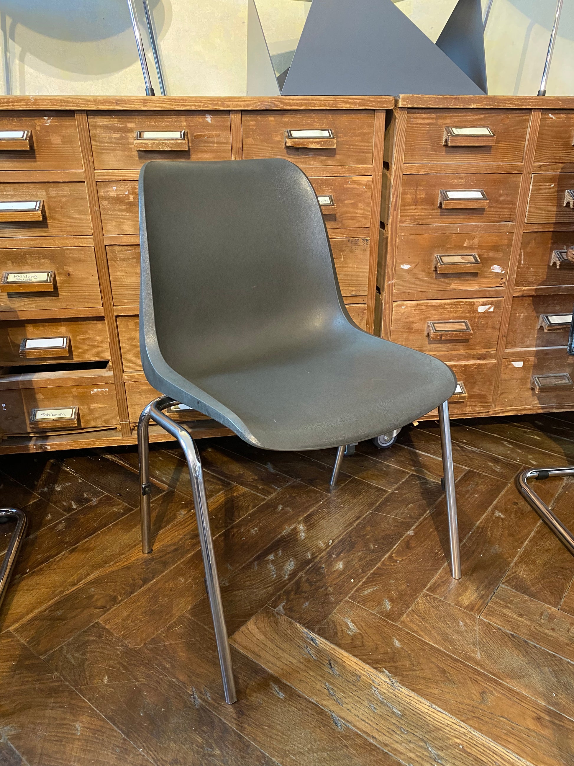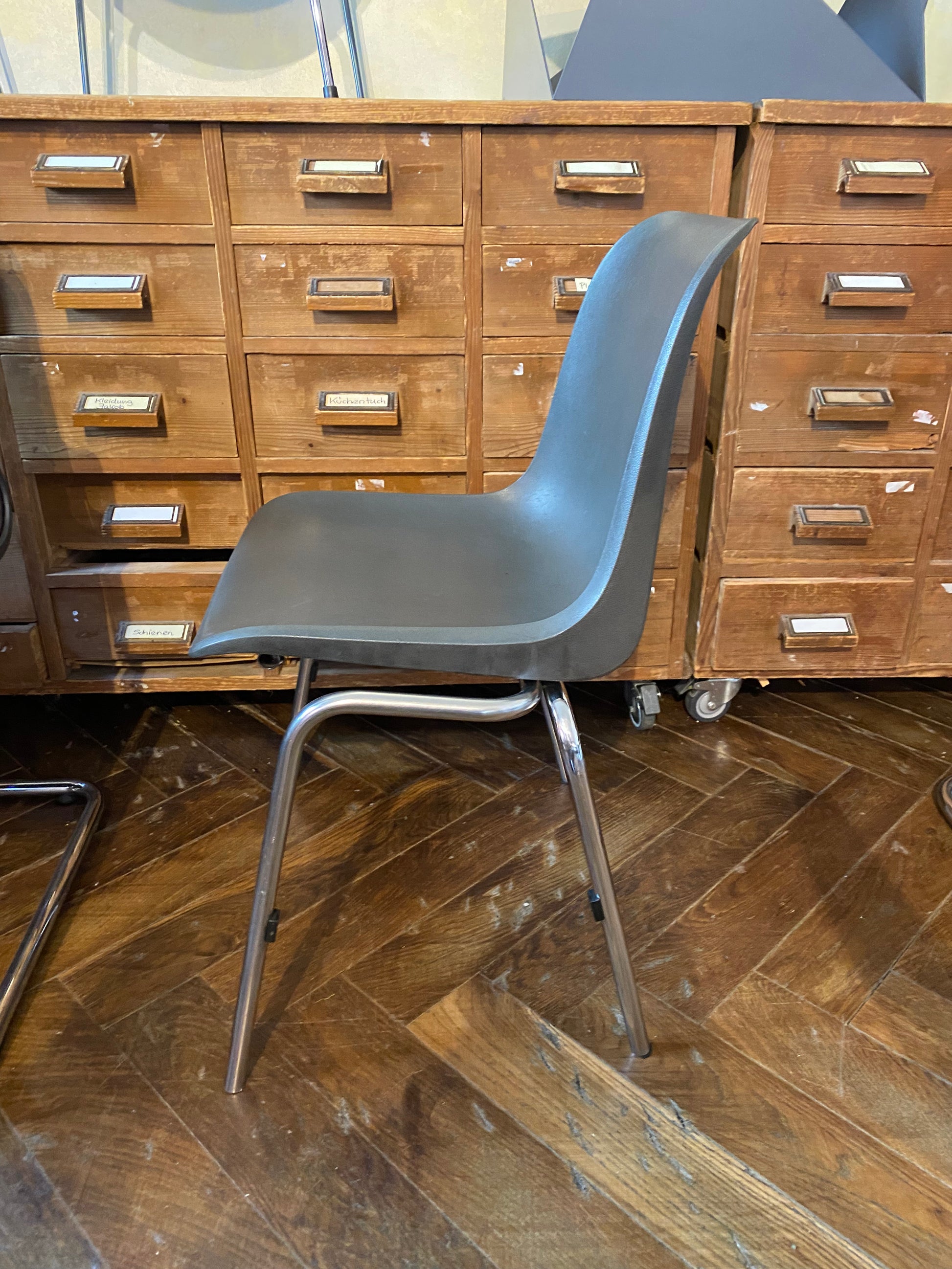 Gebrauchter Schalenstuhl im Vintage Look mit anthrazit-farbener Sitzschale und Chrom-Beinen.